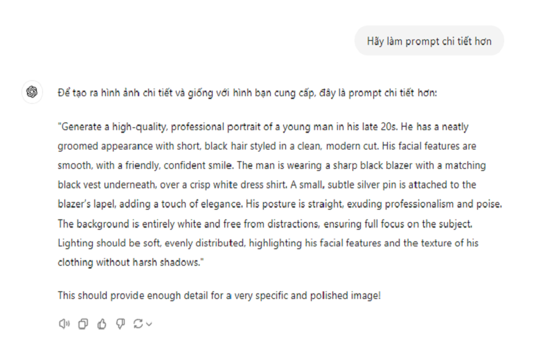 Thông thường với câu lệnh trên, Chat GPT sẽ chỉ đưa ra một Prompt khá ngắn nên sẽ không tạo được hình, vì thế hãy tiếp tục yêu cầu Chat GPT “Làm prompt chi tiết hơn”.