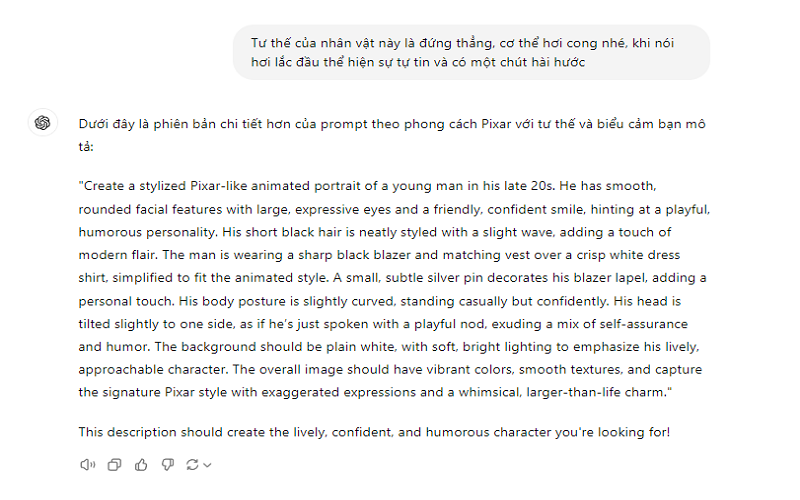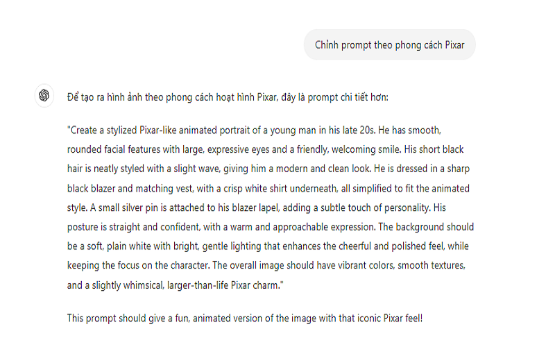 Lúc này để hoạt hình hóa được hình ảnh ở trên các sếp sẽ có rất nhiều phong cách khác nhau từ anime, ghibli, disney, pixar.... Nhưng ở đây chúng mình khuyến khích chọn style Pixar vì đây sẽ là phong cách rất bắt mắt với các chi tiết nhân vật 3D. Vì thế hãy yêu cầu Chat GPT “Điều chỉnh prompt theo phong cách Pixar”
