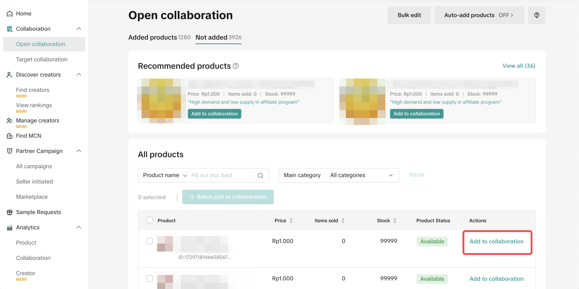 Sếp có thể dễ dàng thêm Hoa Hồng Quảng Cáo Mua Sắm cho sản phẩm của mình thông qua phần Cộng Tác Mở, bao gồm cả danh sách "Sản phẩm đã thêm" và "Chưa được thêm". Ở đây, chúng tôi sẽ hướng dẫn sếp thao tác từ mục "Chưa được thêm". Để truy cập vào Cộng Tác Mở, sếp chỉ cần bấm vào liên kết thích hợp.