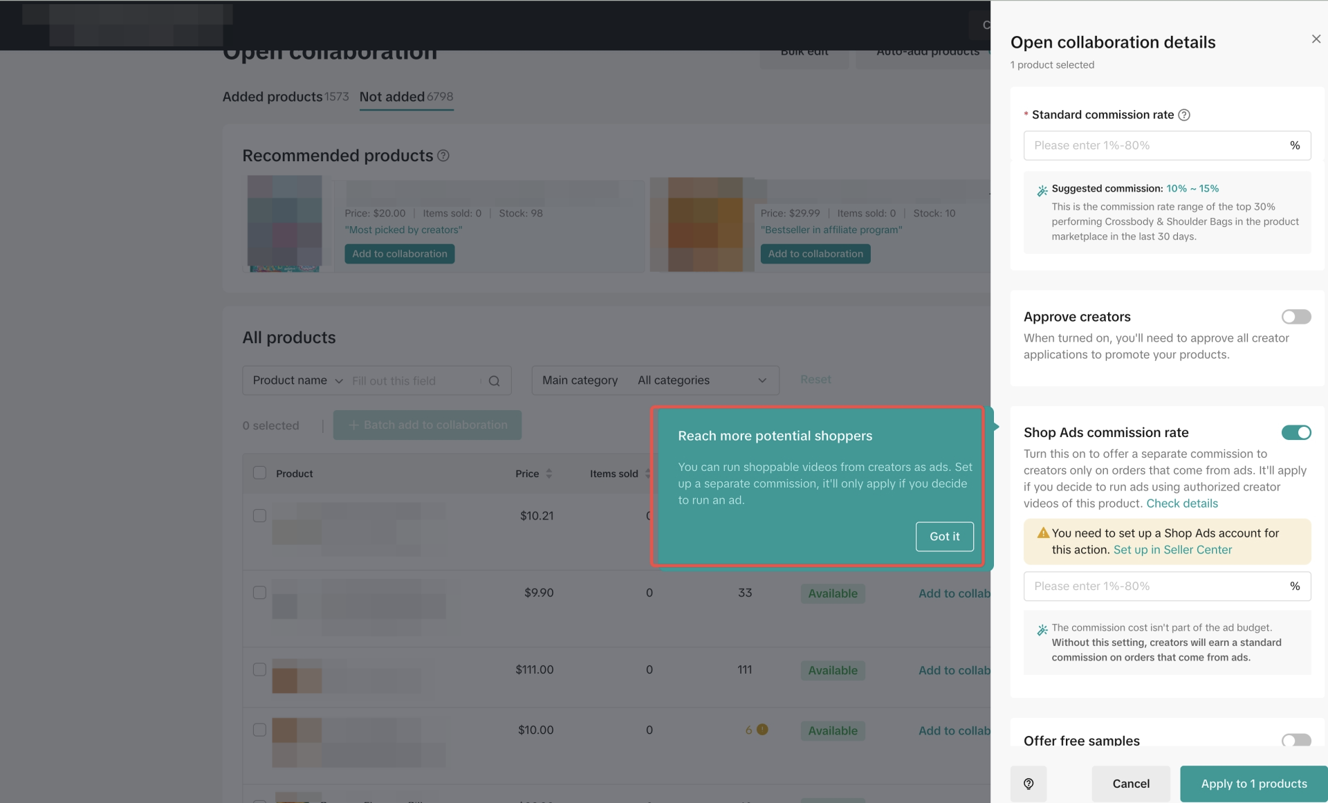 2. Có thể áp dụng Hoa Hồng Quảng Cáo cho sản phẩm đã được thêm vào Cộng Tác Mục Tiêu hoặc chiến dịch TAP hay không?