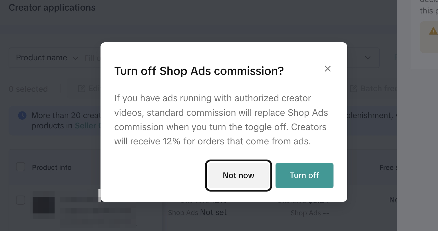 Lưu ý quan trọng: Việc tắt Hoa Hồng Quảng Cáo Mua Sắm không có nghĩa là tắt cả Quảng Cáo Mua Sắm dạng video của Nhà Sáng Tạo. Để tắt Quảng Cáo Mua Sắm dạng video, sếp cần truy cập vào Trình quản lý quảng cáo TikTok qua liên kết thích hợp.