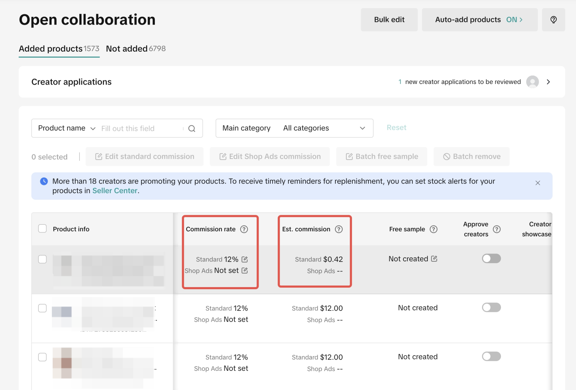 Sau khi sếp đã thiết lập Hoa Hồng Quảng Cáo Mua Sắm cho sản phẩm, tỷ lệ hoa hồng này sẽ được hiển thị trong cột "Tỷ lệ hoa hồng" và cột "Hoa hồng ước tính" bên dưới.