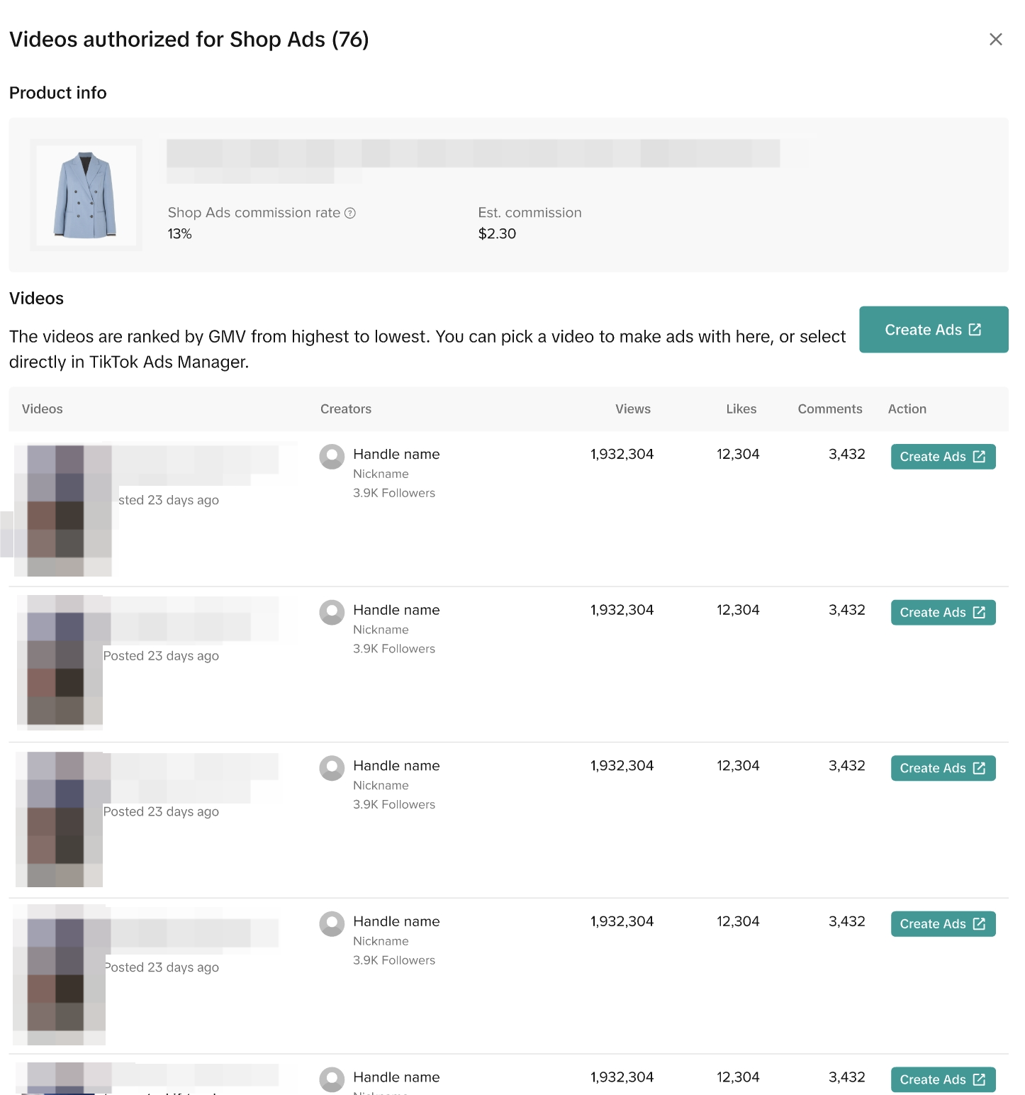 Sếp chỉ cần nhấp vào số dưới cột "Video đã ủy quyền làm Quảng Cáo Mua Sắm" để mở một cửa sổ hiển thị các video có sẵn mà sếp có thể sử dụng để quảng bá sản phẩm. Nhấp vào nút "Tạo quảng cáo" sẽ đưa sếp đến trình quản lý quảng cáo để thực hiện các bước tiếp theo.