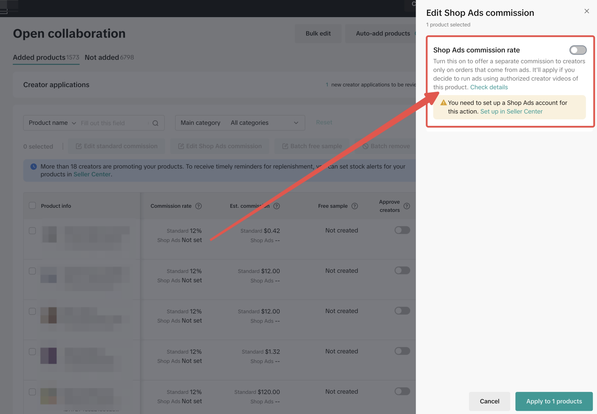 Khi đó, trang "Chi tiết về Cộng Tác Mở" sẽ hiện ra, kèm theo mục Hoa Hồng Quảng Cáo Mua Sắm. Mục này sẽ có mặt ngay cả khi sếp chưa có tài khoản Quảng Cáo Mua Sắm, và sếp có thể tạo tài khoản mới trong phần "Thiết lập" trên Trung tâm Nhà Bán Hàng.